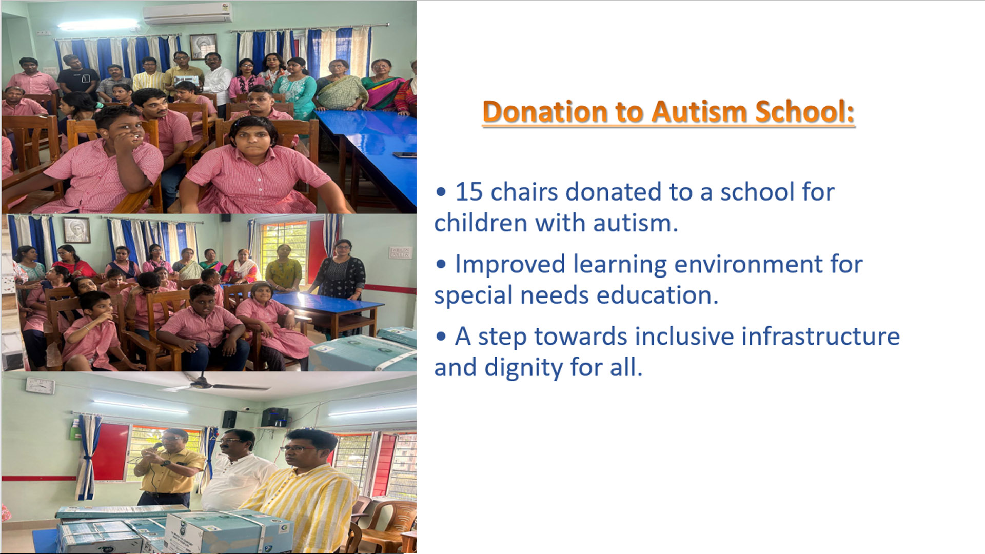 15 chairs donated to a school for children with autism.Improved learning environment for special needs education.