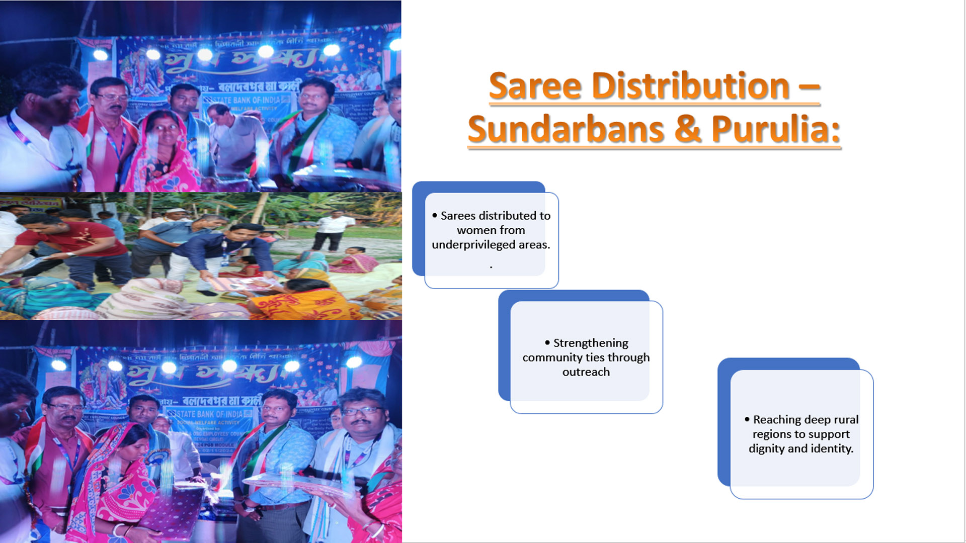 200 sarees were distributed to underprivileged women, promoting dignity and support.