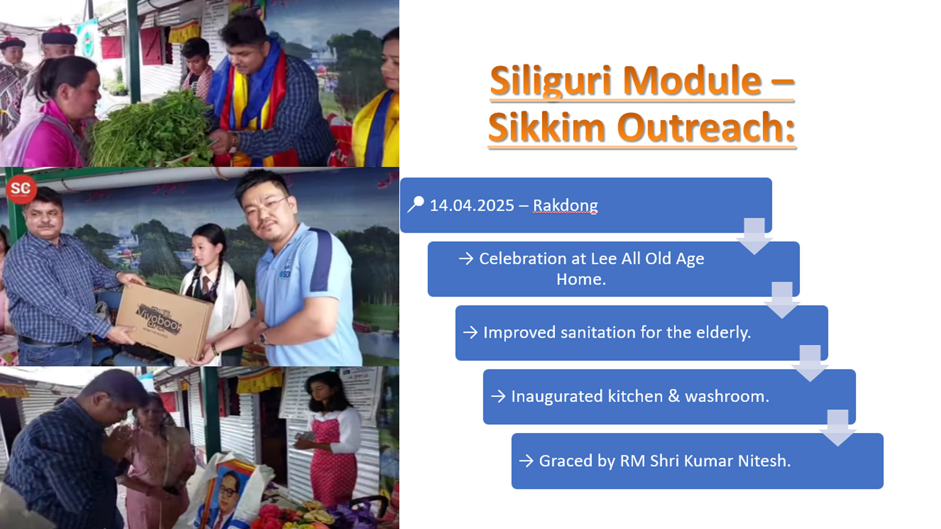 A celebration was held at Lee All Old Age Home, Rakdong Tintek, East Sikkim, graced by RM Shri Kumar Nitesh.A newly constructed kitchen and washroom were inaugurated under SBI’s CSR initiative.